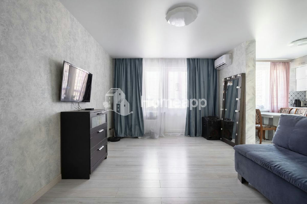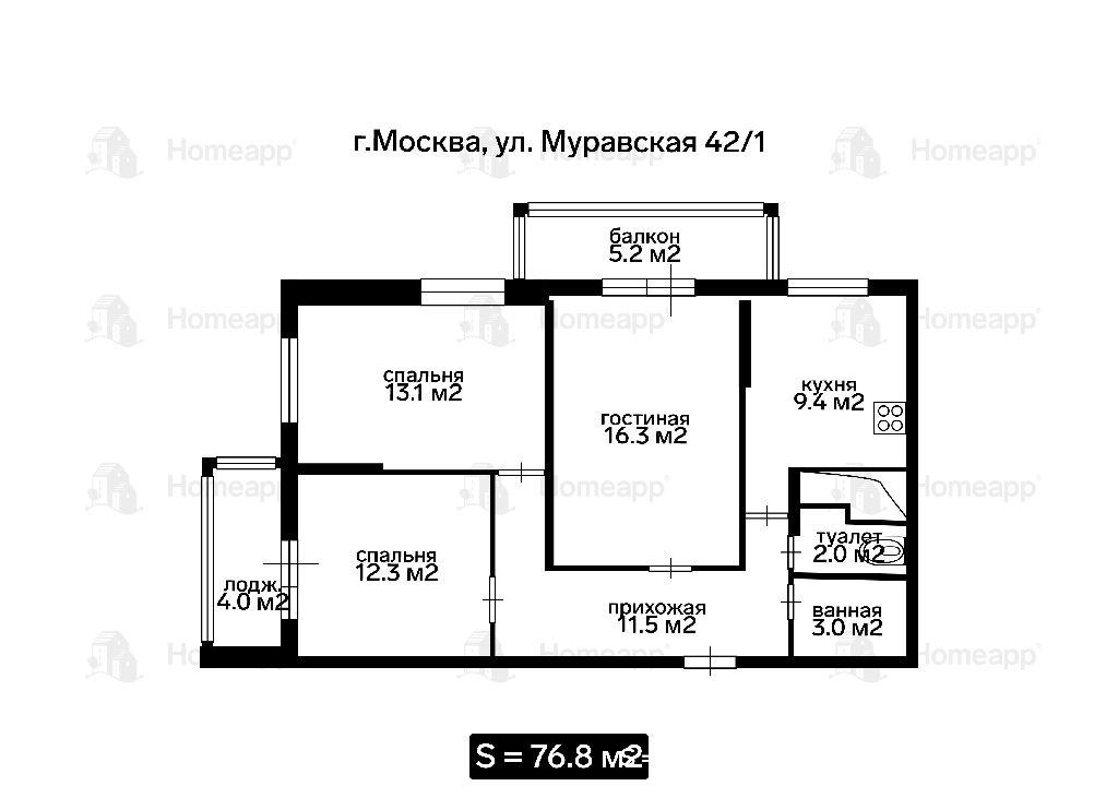 Общая площадь составляет 76,8 м2 (с учётом балкона и лоджии), без учёта 67,6 м2. Жилая площадь 41,7 м2. Квартира расположена на 7 этаже 25-этажного дома, построенного в 2019 году.